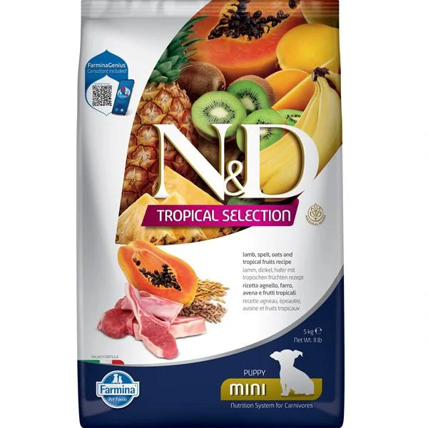 N&D Tropical Selection Dog Puppy Mini Lamb je kompletní krmivo s jehněčím pro štěňata malých plemen a březí nebo kojící feny. Pro natěšené a mlsné jazýčky je tu nová řada oblíbeného krmiva N&D, která kombinuje kvalitní bílkoviny, nízkoglykemické obiloviny a chutné tropické ovoce. Mango, papája, kiwi, ananas a banán mají skvělé nutriční vlastnosti a krmivu dodají parádní porci přírodních antioxidantů a vitamínů. Večeře s krmivem N&D Tropical Selection vaše štěňátko zasytí i potěší.