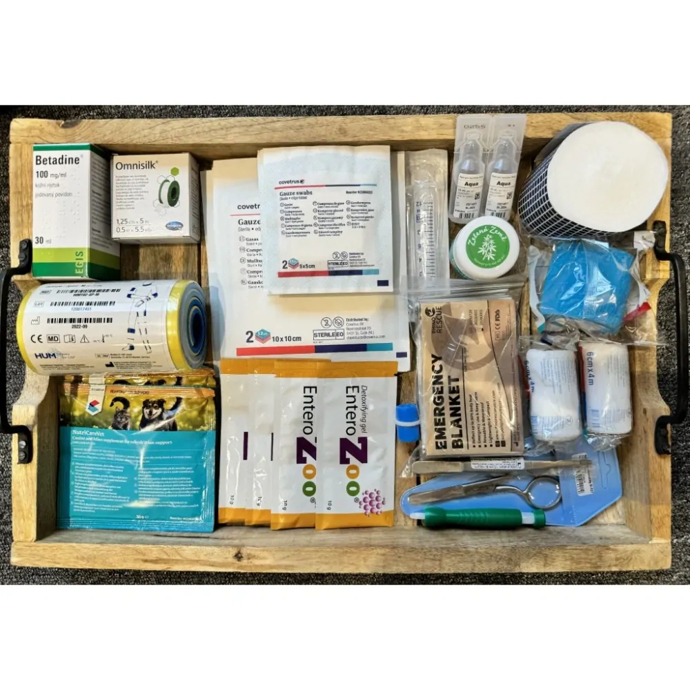 Naše lékárnička se od jiných odlišuje tím, že v ní není pouze obvazový materiál, ale věci, které mohou opravdu zachránit život nebo zvíře dobře nachystat na cestu na veterinu. Najdete v ní například tvarovatelnou a stříhací dlahu na zlomeniny. Nechybí Eterozoo na průjmy, zvracení, ale také na rány. Rehydratační roztok, který dodá vyčerpanému zvířeti potřebné ionty a minerály. A mnoho dalšího.